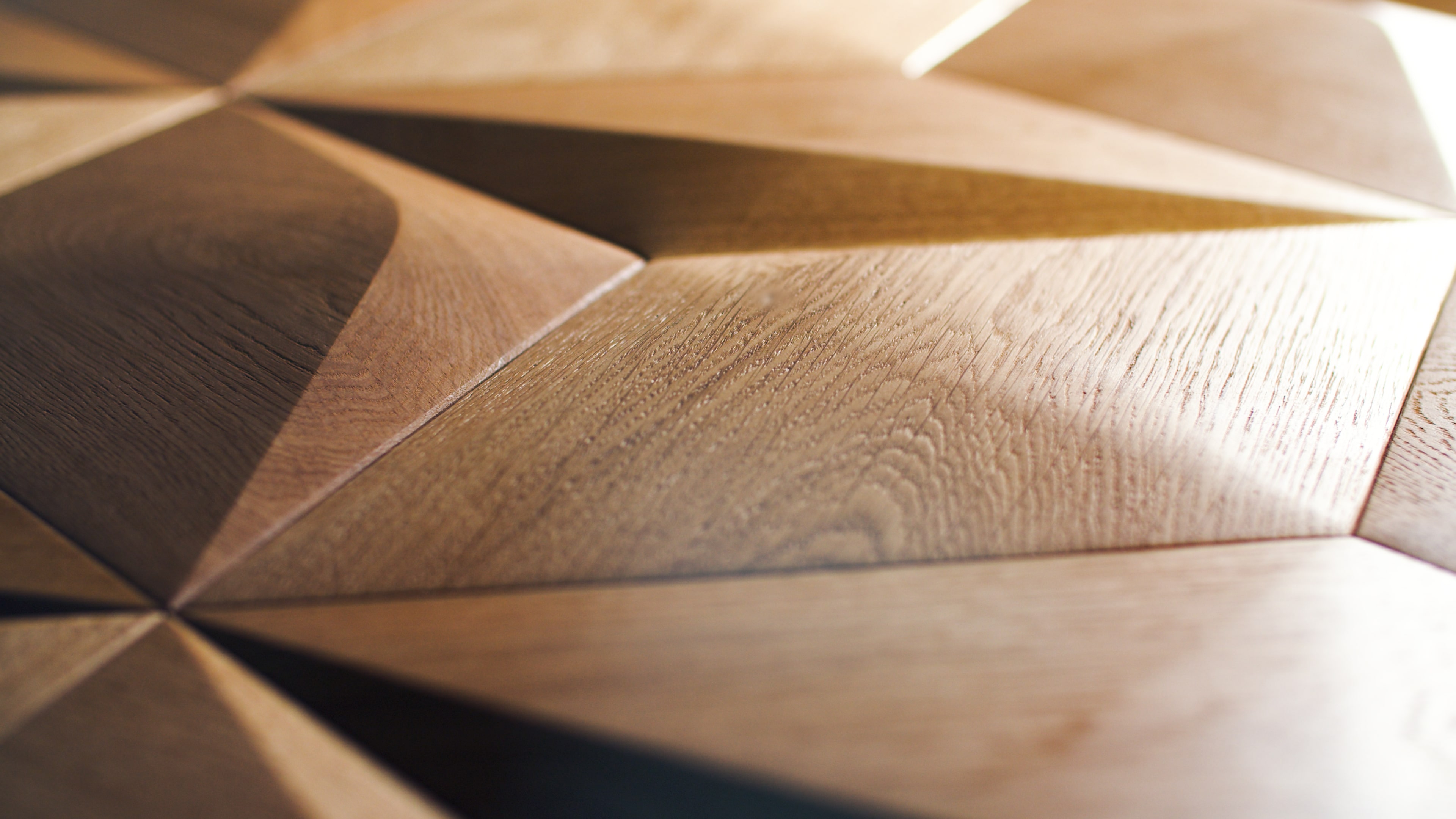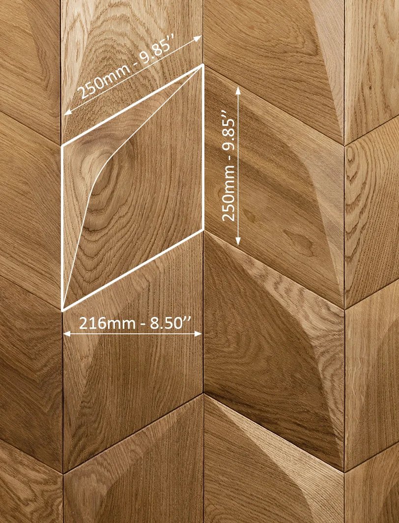 Panel CARO MÍNUS z kolekce broušených dřevěných panelů má příjemný organický design s jemným reliéfem. Trojrozměrná přední strana umístěná na rovnostranném kosočtvercovém poli odkazuje na tvar pouštních dun a mořských vln. Symetrický design a jemné tvary dodávají interiéru klid a harmonii.