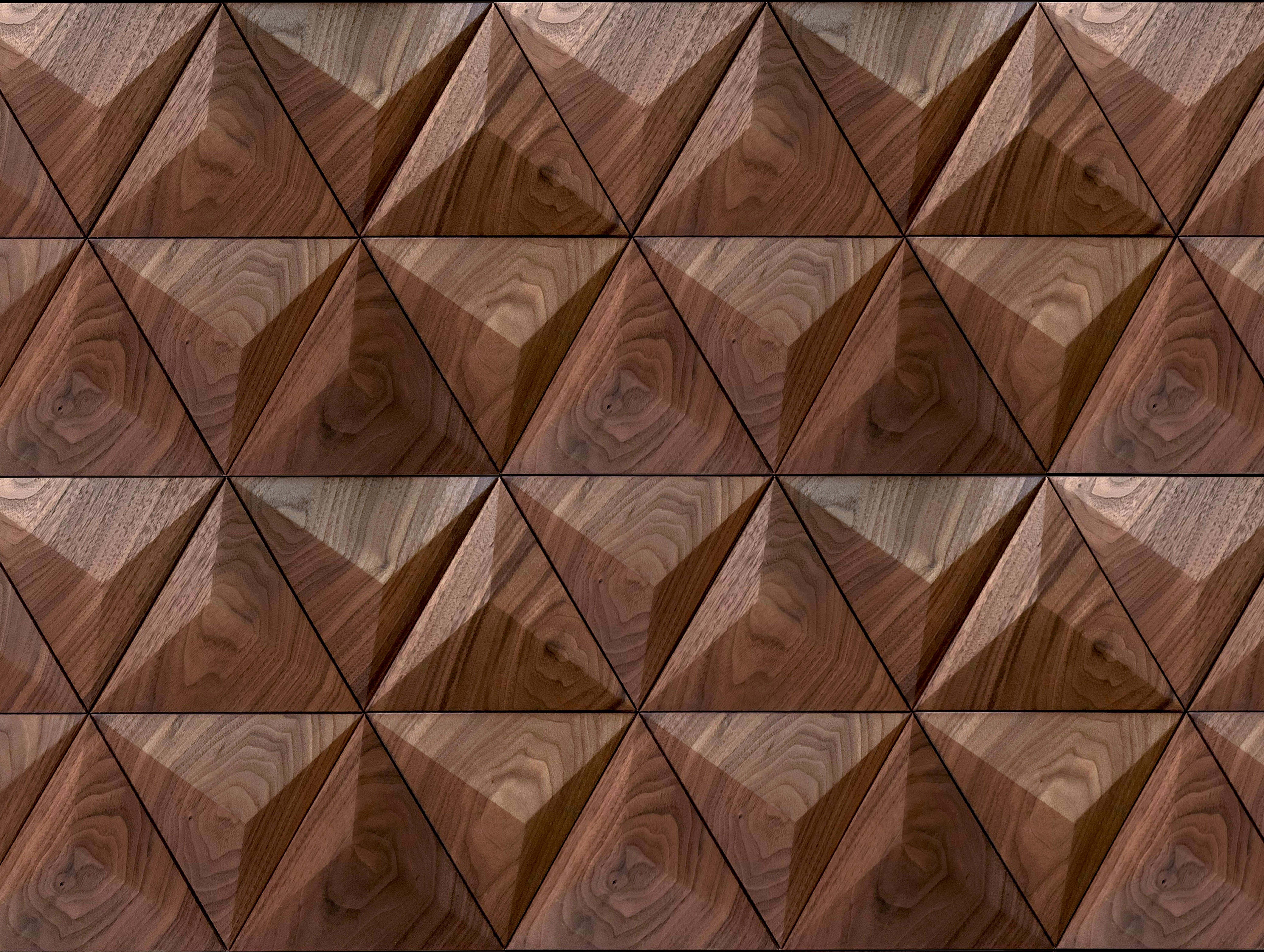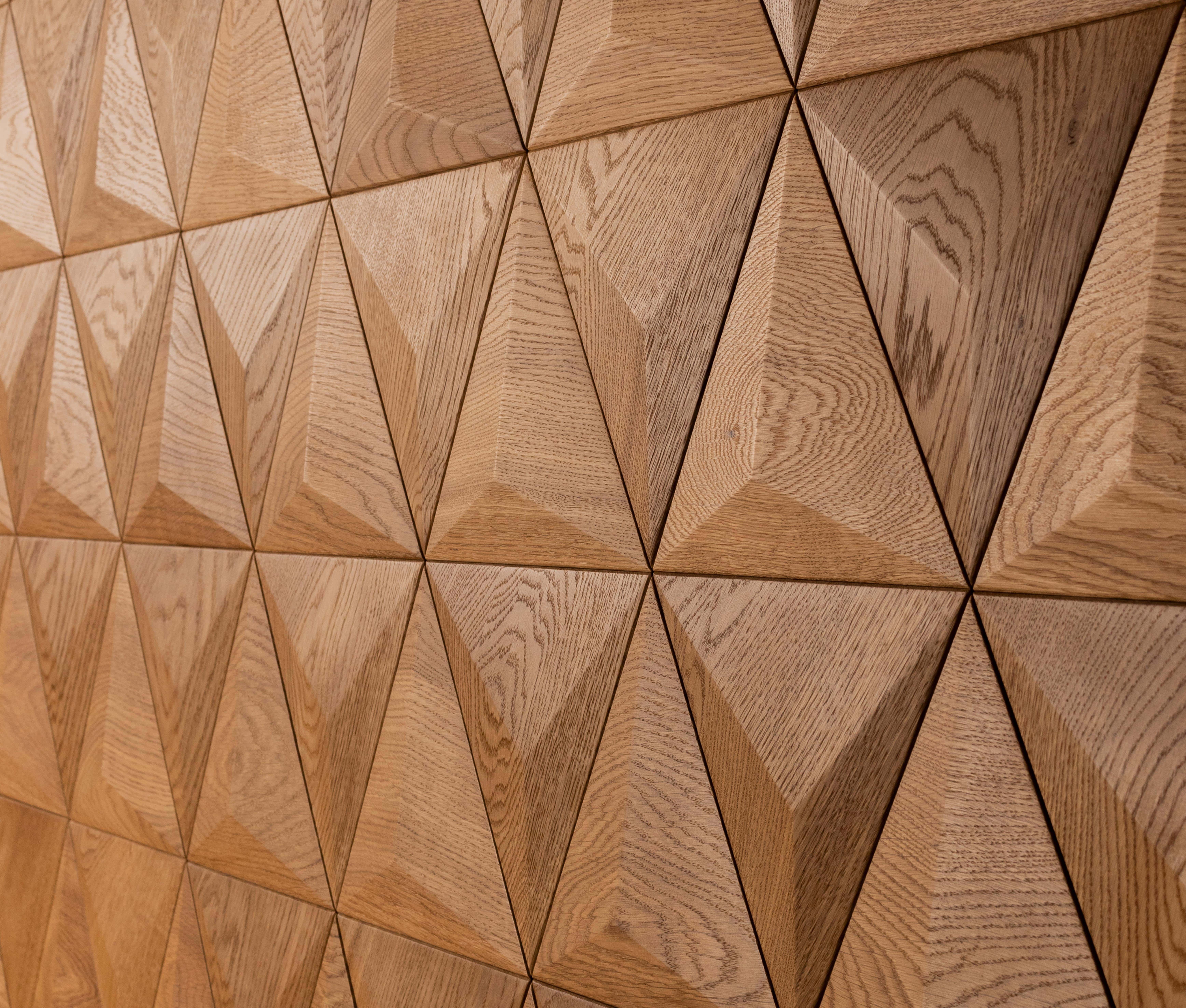 Kolekce broušených panelů nabízí celou paletu inspirativních geometrických vzorů. Trojrozměrný tvar vytvořený opracováním dřeva pod různými úhly umocňuje komplexnost díla.
