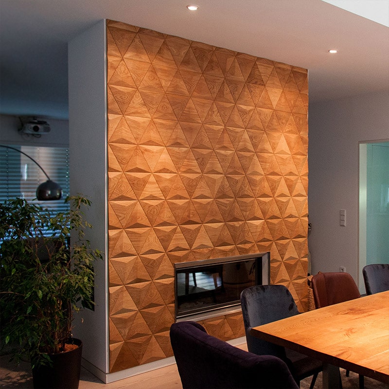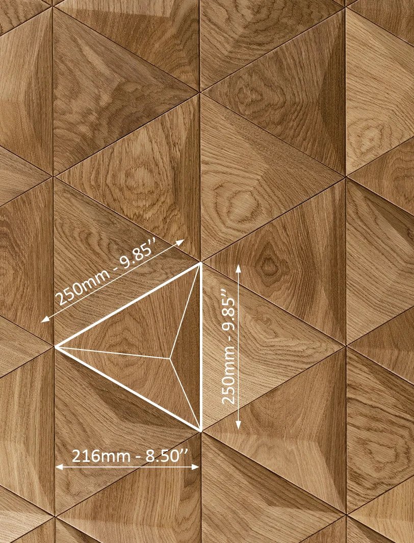 PYRAMID z kolekce broušených panelů má tvar rovnostranného trojúhelníka, jehož přední strana je tvořená třemi plochami nepravidelného jehlanu. Kresba přírodního dřeva plynule prochází jasnou geometrickou formou, čímž jsou akcentované světlé plochy pyramidy. Rytmické opakování jednoduchého geometrického tvaru přináší do interiéru výrazný detail, který je oslavou struktury dřeva a jeho krásy.